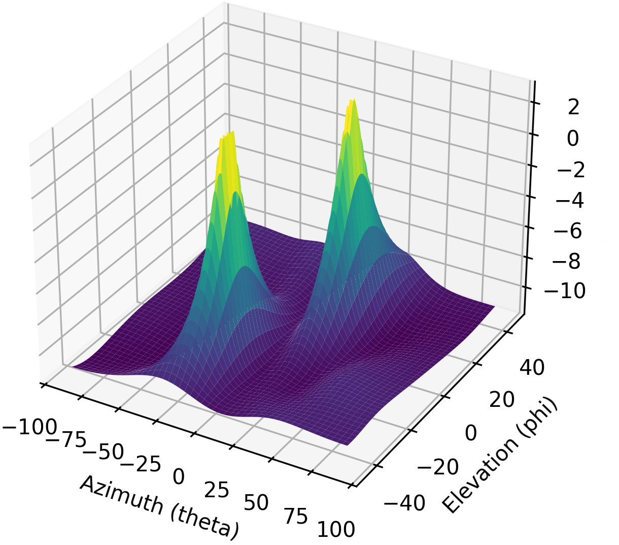 Our results are in 2D, because the array is 2D, so we must either use a 3D plot or a 2D heatmap plot. Let’s try both. First, we will do a 3D plot that has elevation on one axis and azimuth on the other: