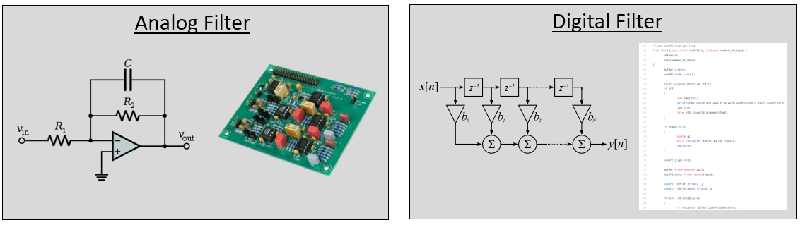 You may think we only care about digital filters; this textbook explores DSP, after all. However, it’s important to know that a lot of filters will be analog, like those in our SDRs placed before the analog-to-digital converter (ADC) on the receive side. The following image juxtaposes a schematic of an analog filter circuit with a flowchart representation of a digital filtering algorithm.