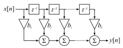 You might be wondering why we wouldn’t just set the transition width as small as possible. The reason is mainly that a smaller transition width results in more taps, and more taps means more computations–we will see why shortly. A 50-tap filter can run all day long using 1% of the CPU on a Raspberry Pi. Meanwhile, a 50,000 tap filter will cause your CPU to explode! Typically we use a filter designer tool, then see how many taps it outputs, and if it’s way too many (e.g., more than 100) we increase the transition width. It all depends on the application and hardware running the filter, of course.