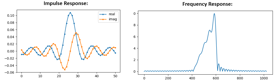 The filter I showed you had real taps, but taps can also be complex. Whether the taps are real or complex doesn’t have to match the signal you put through it, i.e., you can put a complex signal through a filter with real taps and vice versa. When the taps are real, the filter’s frequency response will be symmetrical around DC (0 Hz). Typically we use complex taps when we need asymmetry, which does not happen too often.