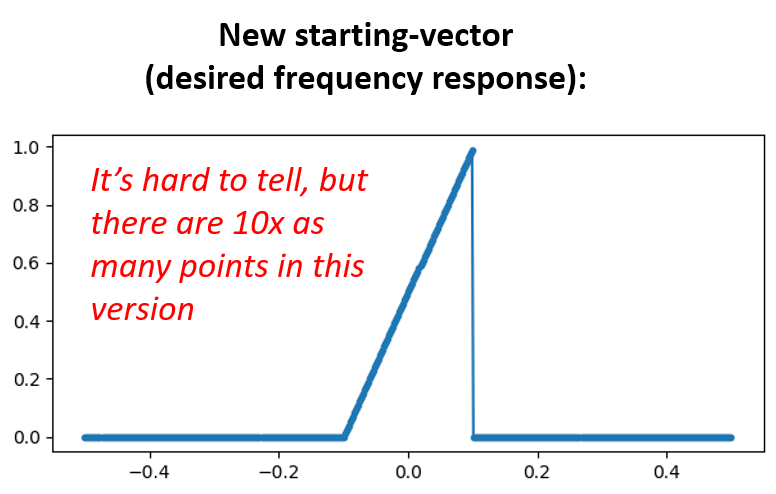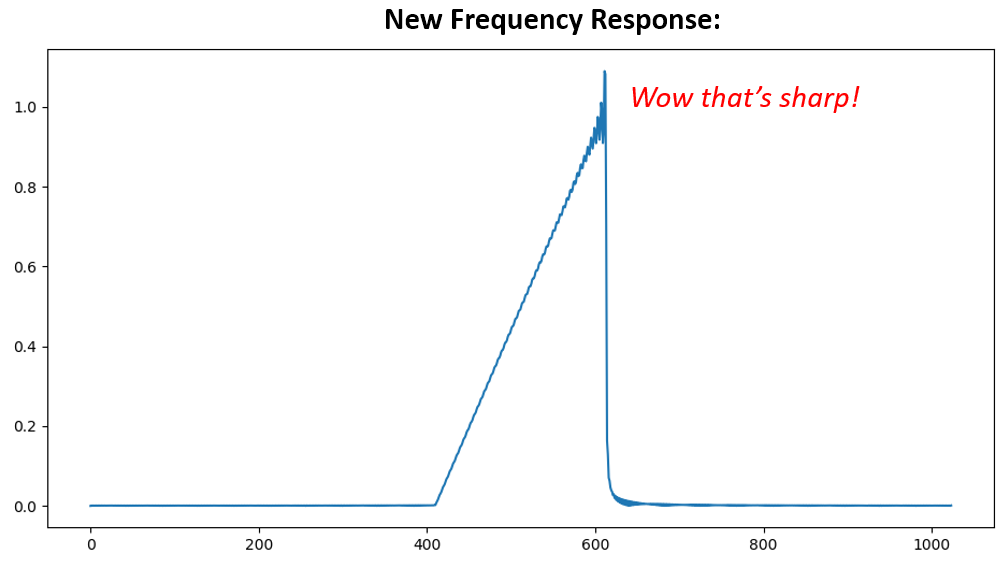 See how the frequency response not very straight… it doesn’t match our original very well, if you recall the shape that we initially wanted to make a filter for. A big reason is because our impulse response isn’t done decaying, i.e., the left and right sides don’t reach zero. We have two options that will allow it to decay to zero: