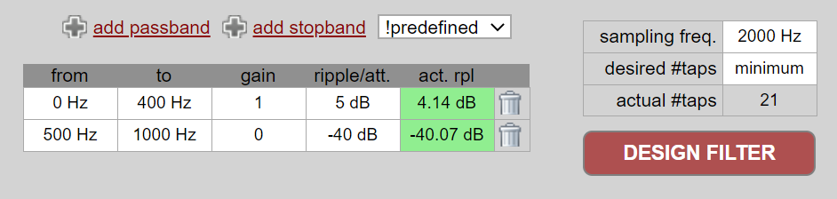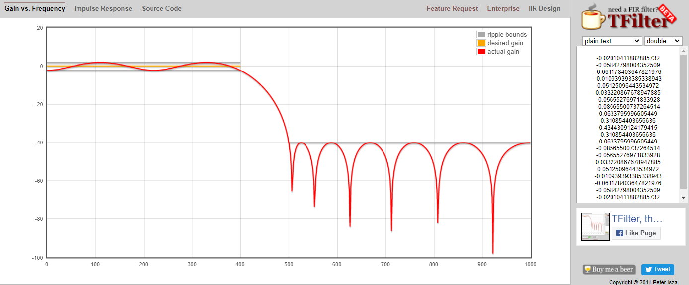 You can also use tools outside of Python to design a custom FIR filter. For students I recommend this easy-to-use web app by Peter Isza that will show you impulse and frequency response: http://t-filter.engineerjs.com. Using the default values, at the time of writing this at least, it’s set up to design a low-pass filter with a passband from 0 to 400 Hz and stopband from 500 Hz and up. The sample rate is 2 kHz, so the max frequency we can “see” is 1 kHz.