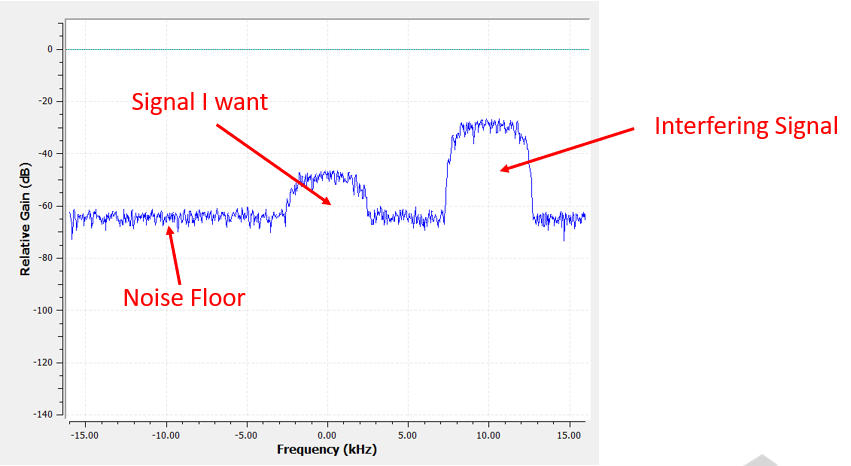 To learn how filters are used, let’s look an an example where we tune our SDR to a frequency of an existing signal, and we want to isolate it from other signals. Remember that we tell our SDR which frequency to tune to, but the samples that the SDR captures are at baseband, meaning the signal will display as centered around 0 Hz. We will have to keep track of which frequency we told the SDR to tune to. Here is what we might receive:
