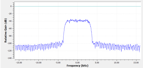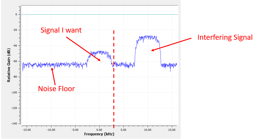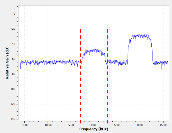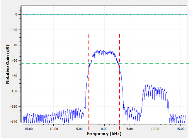 This filtered signal will look confusing until you recall that our noise floor was at the green line around -65 dB. Even though we can still see the interfering signal centered at 10 kHz, we have severely decreased the power of that signal. It’s now below where the noise floor was! We also removed most of the noise that existed in the stopband.