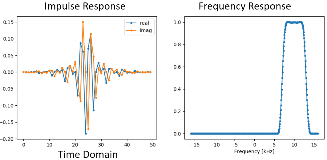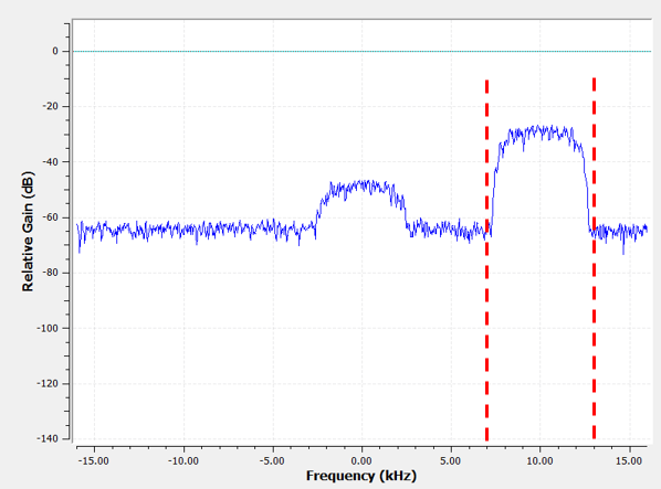 As an example of complex taps, let’s go back to the filtering use-case, except this time we want to receive the other interfering signal (without having to re-tune the radio). That means we want a band-pass filter, but not a symmetrical one. We only want to keep (a.k.a “pass”) frequencies between around 7 kHz to 13 kHz (we don’t want to also pass -13 kHz to -7 kHz):