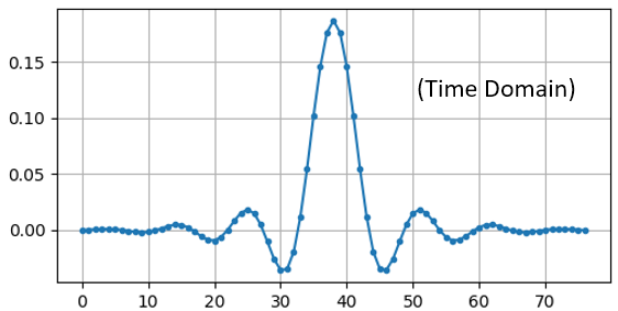 A given filter also has a time domain representation; it’s called the “impulse response” of the filter because it is what you see in the time domain if you take an impulse and put it through the filter. (Google “Dirac delta function” for more info about what an impulse is). For a FIR type filter, the impulse response is simply the taps themselves. For that 77 tap filter we used earlier, the taps are: