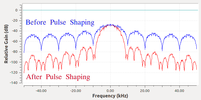 Note how much quicker the signal drops off in frequency. The sidelobes are ~30 dB lower after pulse shaping; that’s 1,000x less! And more importantly, the main lobe is narrower, so less spectrum is used for the same amount of bits per second.