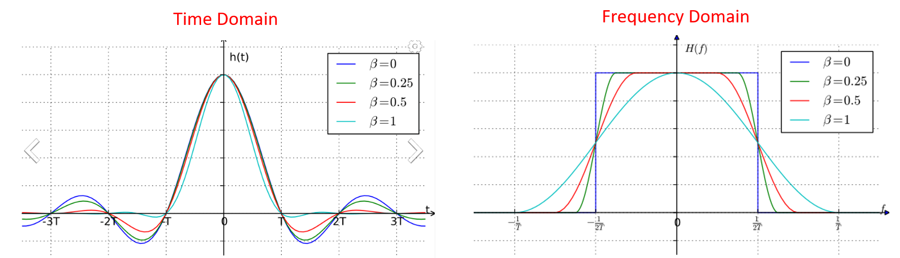 These filters generally have a parameter you can adjust to decrease the bandwidth used. Below demonstrates the time and frequency domain of a raised-cosine filter with different values of \(\beta\), the parameter that defines how steep the roll-off is.