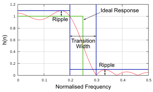 Let’s visualize transition width. In the diagram below, the green line represents the ideal response for transitioning between a passband and stopband, which essentially has a transition width of zero. The Red line demonstrates the result of a realistic filter, which has some ripple and a certain transition width.
