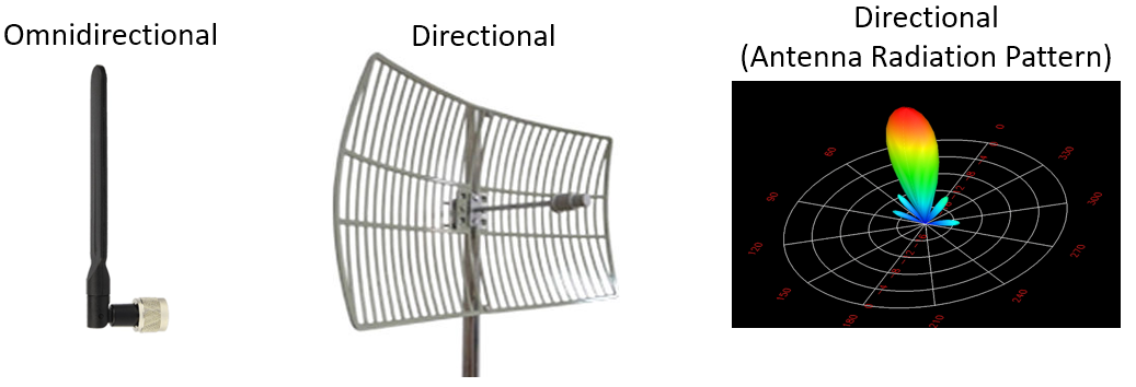 Gains will be depicted in dB (unit-less); feel free to learn or remind yourself why dB is unit-less for our scenario in the Noise and dB chapter. Typically, antennas are either omnidirectional, meaning their power radiates in all directions, or directional, meaning their power radiates in a specific direction. If they are omnidirectional their gain will be 0 dB to 3 dB. A directional antenna will have a higher gain, usually 5 dB or higher, and anywhere up to 60 dB or so.