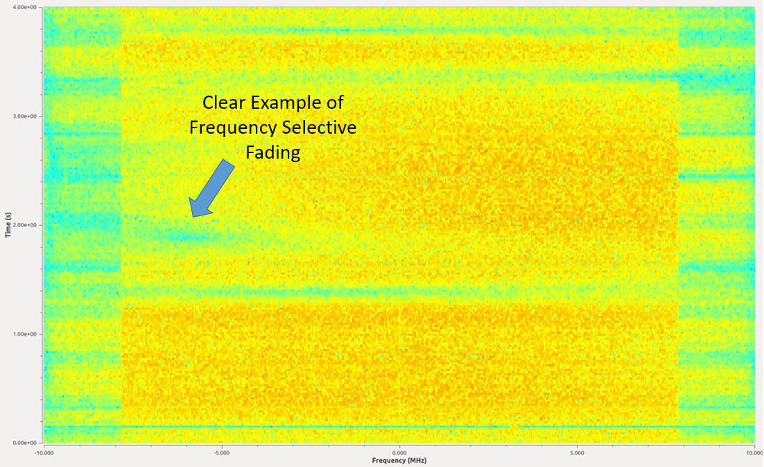 Here is an example of a 16 MHz wide signal that is continuously transmitting. There are several moments in the middle where there’s a period of time a piece of signal is missing. This example depicts frequency selective fading, which causes holes in the signal that wipe out some frequencies but not others.