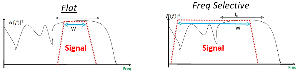 In the figure below, the red shape shows our signal in the frequency domain, and the black curvy line shows the current channel condition over frequency. Because the narrower signal is experiencing the same channel conditions throughout the whole signal, it’s experiencing flat fading. The wider signal is very much experiencing frequency selective fading.