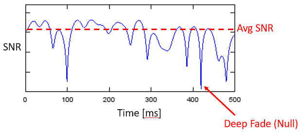 What tends to happen is we get a mix of constructive and destructive interference, and it changes over time as the Rx, Tx, or environment is moving/changing. We use the term “fading” when referring to the effects of a multipath channel changing over time. That’s why we often refer to it as “multipath fading”; it’s really the combination of constructive/destructive interference and a changing environment. What we end up with is a SNR that varies over time; changes are usually on the order of milliseconds to microseconds, depending on how fast the Tx/Rx is moving. Beneath is a plot of SNR over time in milliseconds that demonstrates multipath fading.