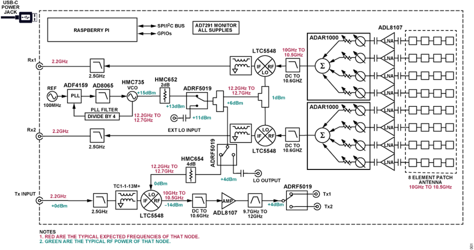 The Phaser is a single board containing the phased array and a bunch of other components, with a Raspberry Pi plugged in on one side and a Pluto mounted to the other side. The high-level block diagram is shown below. Some items to note: