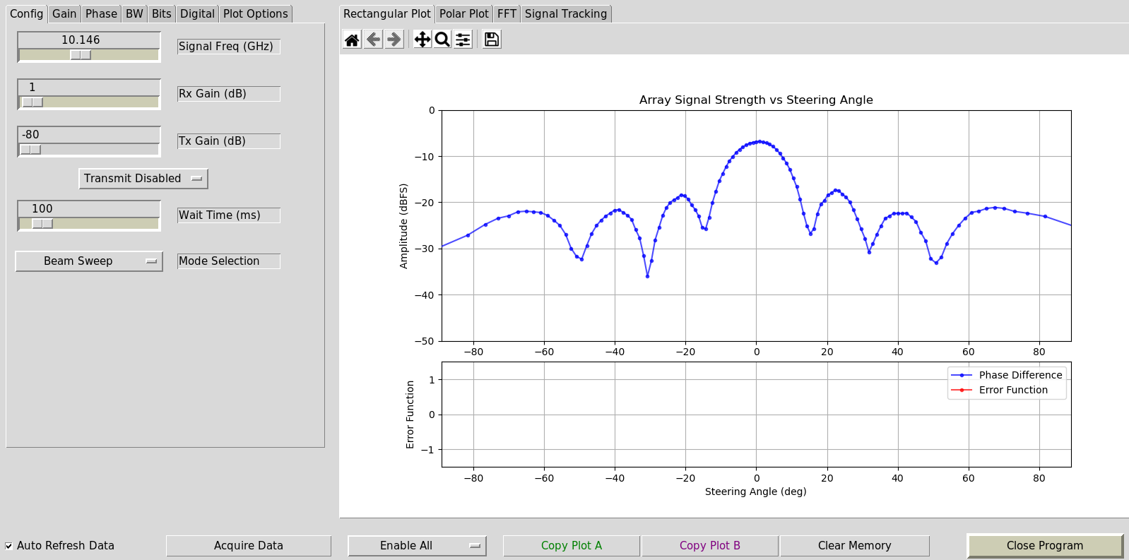You can see the error is essentially the derivative of the phase estimate; because we’re performing successful tracking, the phase estimate is more or less the actual angle of arrival. It’s not clear looking only at these plots, but when there is a sudden movement, it takes the system a small fraction of a second to adjust and catch up. The goal is for the change in angle of arrival to never be so quick that the signal arrives beyond the main lobes of the two beams.