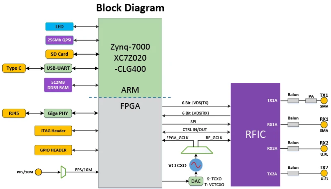 The PlutoSDR (a.k.a. ADALM-PLUTO) is a low-cost SDR (just over $200) that is capable of transmitting and receiving signals from 70 MHz to 6 GHz. It is a great SDR for those who have outgrown the $20 RTL-SDR. The Pluto uses a USB 2.0 interface, which limits the sample rate to around 5 MHz if you want to receive 100% of samples over time. That being said, it can sample up to 61 MHz and you can capture contiguous bursts up to around 10M samples long at a time, allowing the Pluto to capture an enormous amount of spectrum at once. It is technically a 2x2 devices, but the second transmit and receive channels are only accessible through U.FL connectors inside the case, and they share the same oscillators so you can’t receive on two different frequencies at once. Below shows the block diagram of the Pluto, as well as the AD936x which is the RF integrated circuit (RFIC) inside the Pluto.
