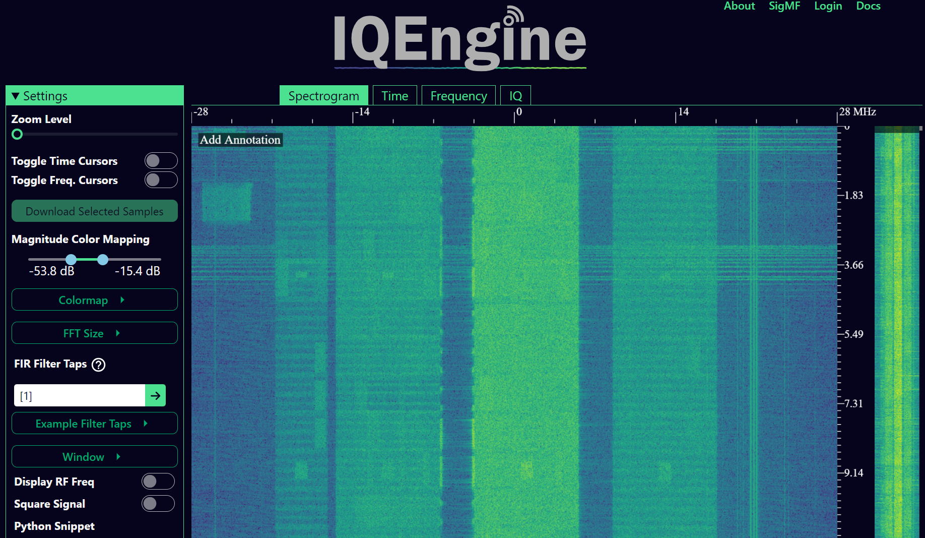 Sampling using the PlutoSDR’s Python API is straightforward. With any SDR app we know we must tell it the center frequency, sample rate, and gain (or whether to use automatic gain control). There might be other details, but those three parameters are necessary for the SDR to have enough information to receive samples. Some SDRs have a command to tell it to start sampling, while others like the Pluto will start to sample as soon as you initialize it. Once the SDR’s internal buffer fills up, the oldest samples are dropped. All SDR APIs have some sort of “receive samples” function, and for the Pluto it’s rx(), which returns a batch of samples. The specific number of samples per batch is defined by the buffer size set beforehand.