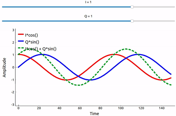 Even though we saw the math, let’s play around with adding two sinusoids that are 90 degrees out of phase. In the video below, there is a slider for adjusting I and another for adjusting Q, the amplitude of the cosine and sine. What is plotted are the cosine (red), sine (blue), and the sum of the two (green).