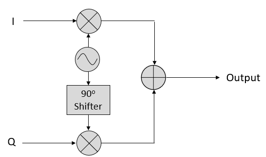 Using this I and Q approach, we can transmit any magnitude and phase we want, using a circuit that looks something like this: