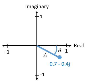 This representation of a sinusoid is known as a “phasor diagram”. It’s simply plotting complex numbers and treating them as vectors. Now what is the magnitude and phase of our example complex number 0.7-0.4j? For a given complex number where \(a\) is the real part and \(b\) is the imaginary part: