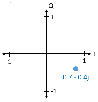 Ultimately, the IQ convention is an alternative way to represent magnitude and phase, which leads us to complex numbers and the ability to represent them on a complex plane. You may have seen complex numbers before in other classes. Take the complex number 0.7-0.4j as an example: