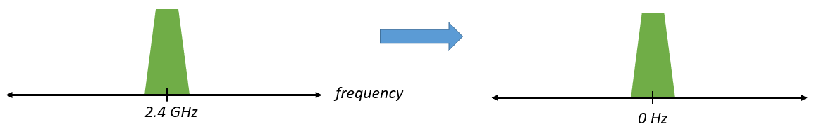 Now back to sampling for a second. Instead of receiving samples by multiplying what comes off the antenna by a cos() and sin() then recording I and Q, what if we fed the signal from the antenna straight into a single ADC? Say the carrier frequency is 2.4 GHz, like WiFi or Bluetooth. That means we would have to sample at 4.8 GHz, as we learned. That’s extremely fast! An ADC that samples that fast costs thousands of dollars. Instead, we “downconvert” the signal so that the signal we want to sample is centered around DC or 0 Hz. This downconversion happens before we sample. We go from: