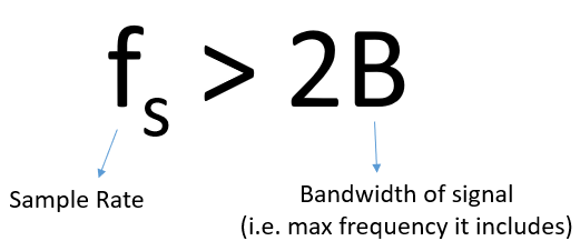 We must identify the highest frequency component, then double it, and make sure we sample at that rate or faster. The minimum rate in which we can sample is known as the Nyquist Rate. In other words, the Nyquist Rate is the minimum rate at which a (finite bandwidth) signal needs to be sampled to retain all of its information. It is an extremely important piece of theory within DSP and SDR that serves as a bridge between continuous and discrete signals.